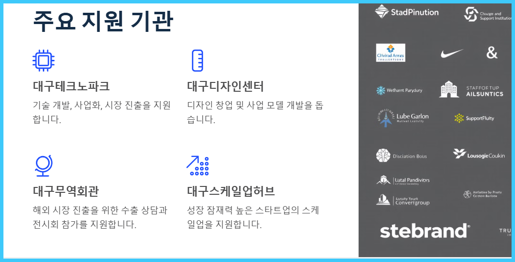 • 대구테크노파크: 기술 개발, 사업화, 시장 진출 등 스타트업 성장 전반을 지원합니다.