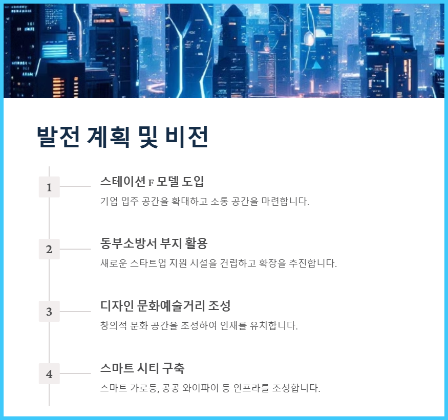 - 동부소방서 부지 활용: 동부소방서 이전 부지를 활용하여 새로운 스타트업 지원 시설을 건립하고, 벤처밸리의 확장을 추진하고 있습니다.