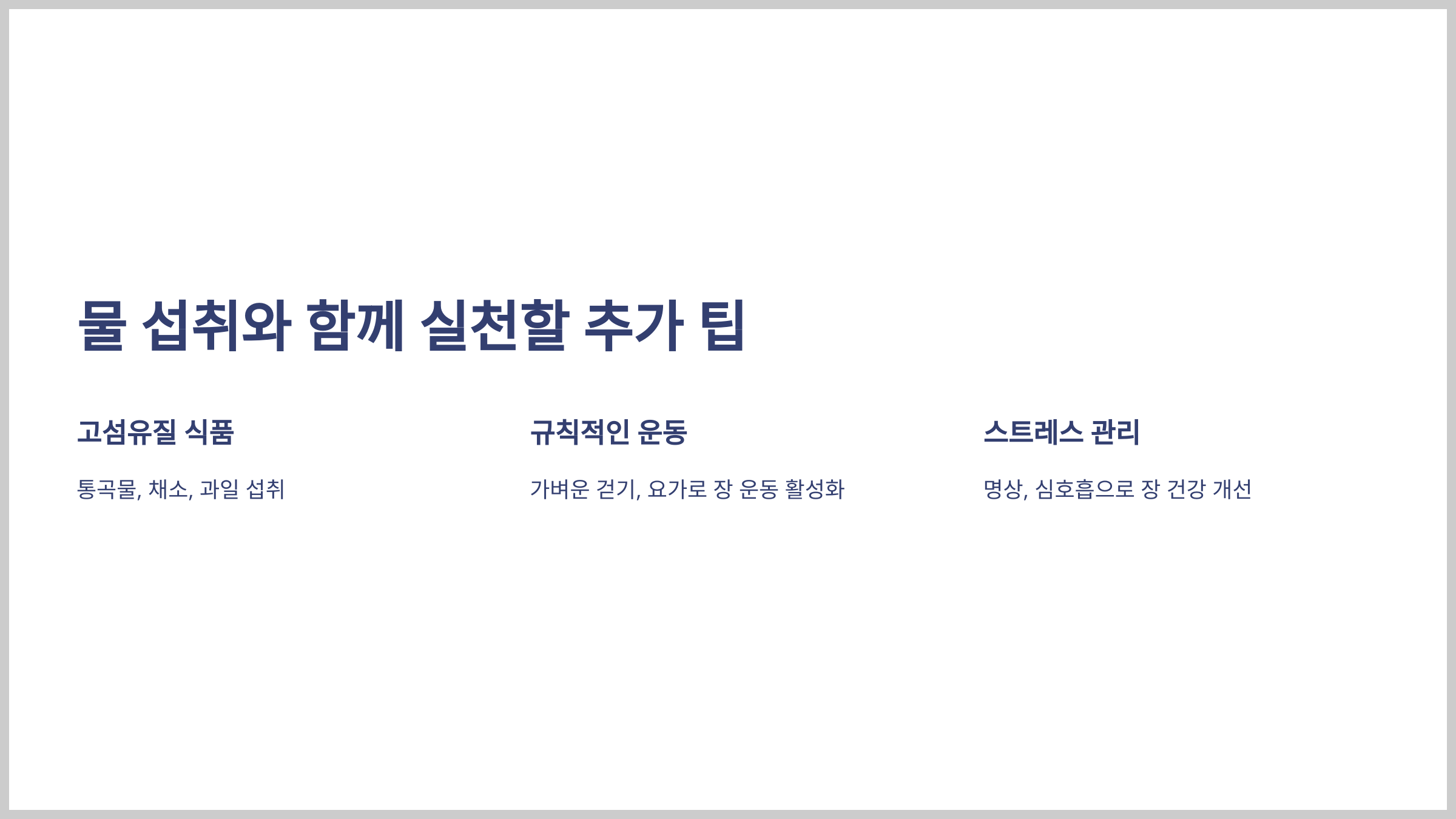 A5. 물 섭취와 함께 섬유질 섭취, 운동, 스트레스 관리 등 다양한 방법을 병행해 보세요. 만약 지속적인 문제가 있다면 전문의와 상담이 필요합니다.