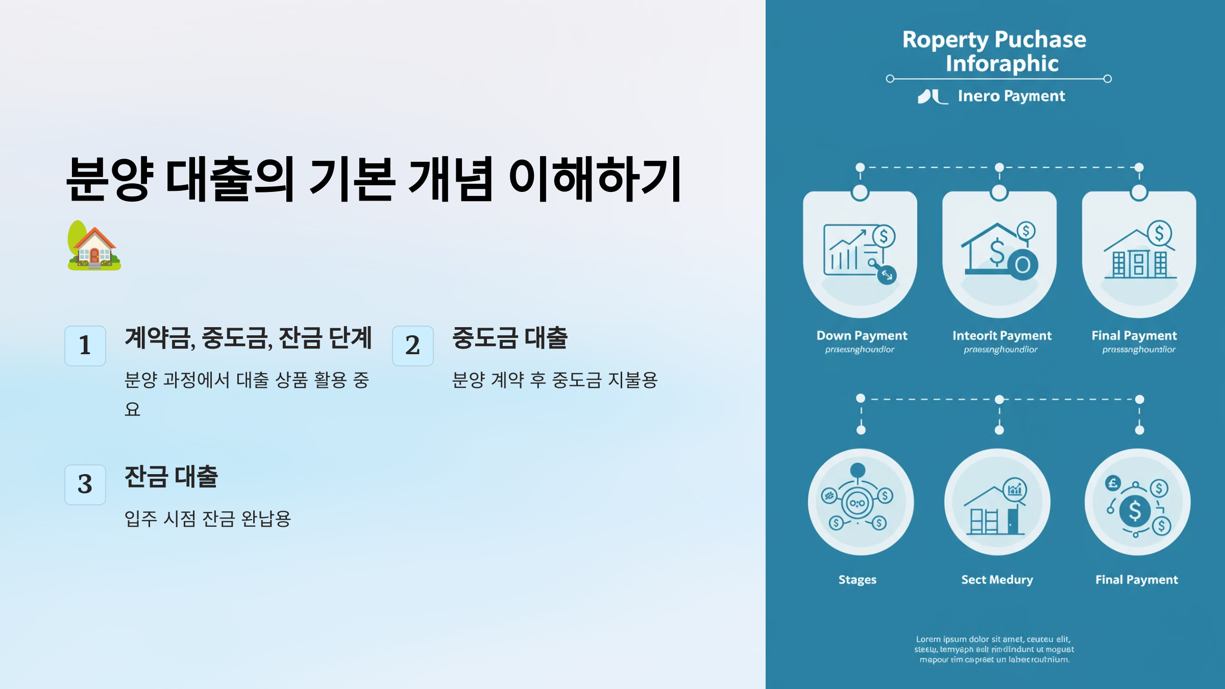 분양 대출은 아파트, 오피스텔 등의 부동산 분양 계약 후 필요한 자금을 마련하기 위해 금융기관에서 빌리는 돈을 말합니다. 일반적으로 분양 계약금, 중도금, 잔금 세 단계로 자금이 필요한데, 이 과정에서 대출 상품을 적절히 활용하는 것이 중요합니다.