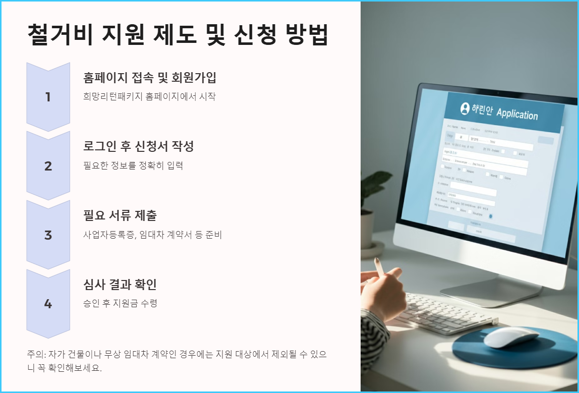 제가 가장 큰 도움을 받은 부분은 바로 철거비 지원이었습니다. 카페 인테리어를 철거하고 원상 복구하는 데 드는 비용이 만만치 않았거든요. 다행히 이 제도를 통해 전용면적 3.3㎡당 약 13만 원, 최대 250만 원까지 지원받을 수 있었습니다.