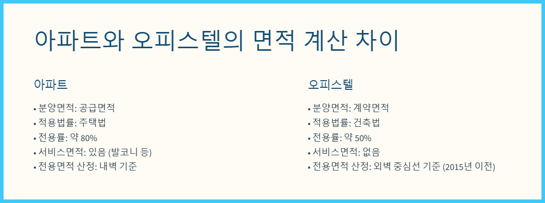 아파트와 오피스텔의 면적 계산에는 중요한 차이가 있습니다.