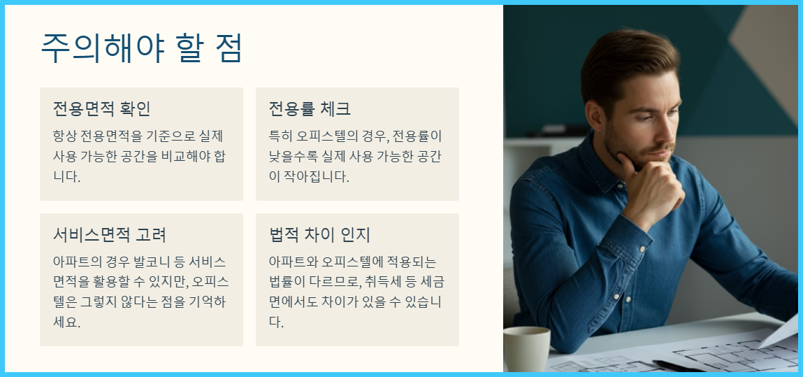 부동산을 구매하거나 임대할 때는 단순히 '평형'이나 '㎡'만 보지 말고, 전용면적, 전용률, 서비스면적 등을 종합적으로 고려해야 합니다. 또한, 같은 면적이라도 아파트와 오피스텔의 실제 사용 가능한 공간에 큰 차이가 있을 수 있다는 점을 항상 기억하세요.