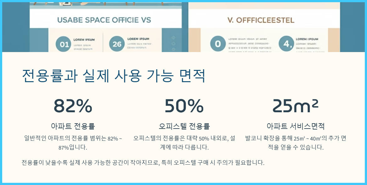 이 예시에서 볼 수 있듯이, 오피스텔 40평형의 전용면적이 아파트 25평형보다 오히려 작습니다. 이는 오피스텔의 전용률이 낮기 때문입니다.