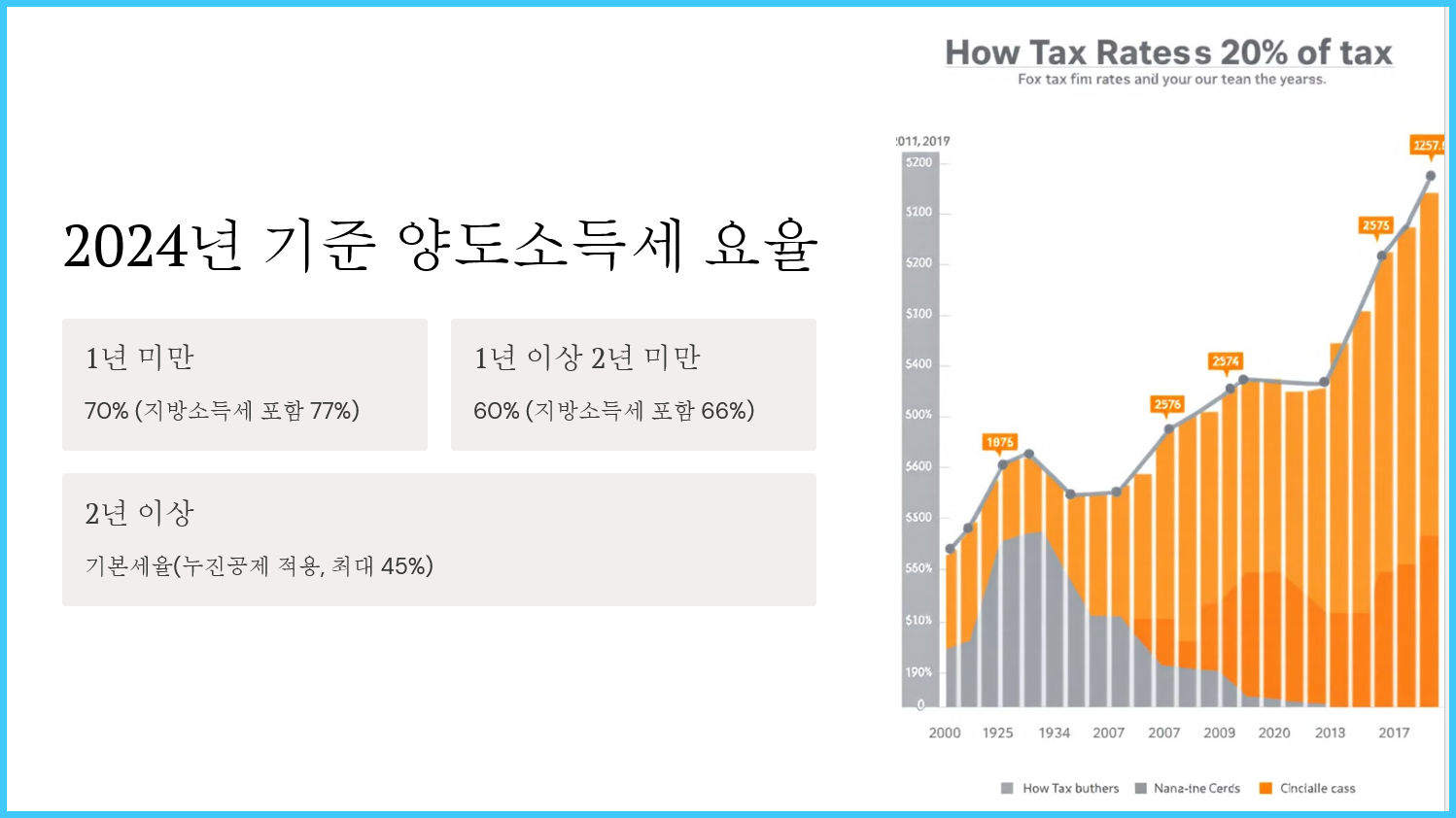 - 2년 이상: 기본세율(누진공제 적용, 최대 45%).