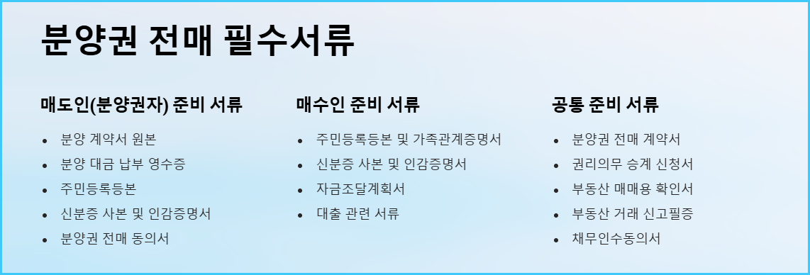 - 분양권 전매 동의서: 시행사 및 분양사무소에서 발급