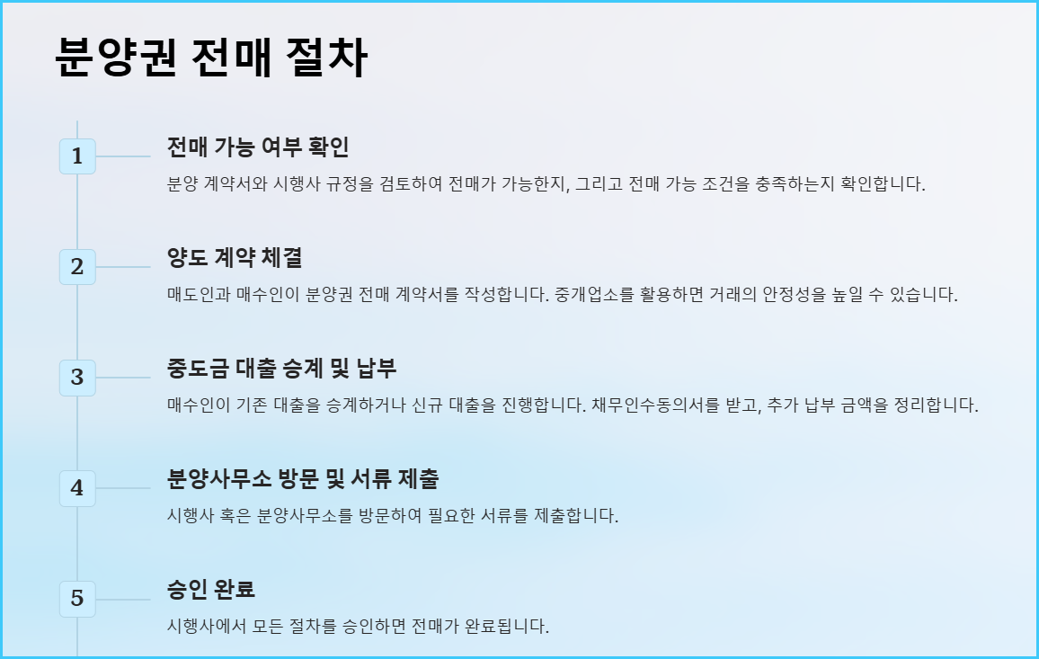 분양권 전매는 다음과 같은 주요 절차로 진행됩니다: