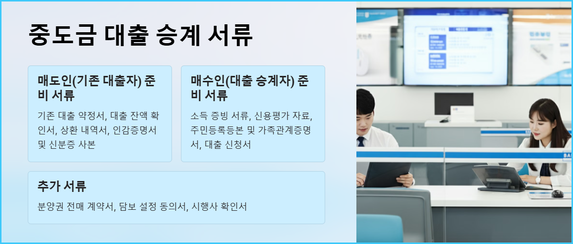 중도금 대출 승계 시 은행에 제출해야 하는 서류는 다음과 같습니다: