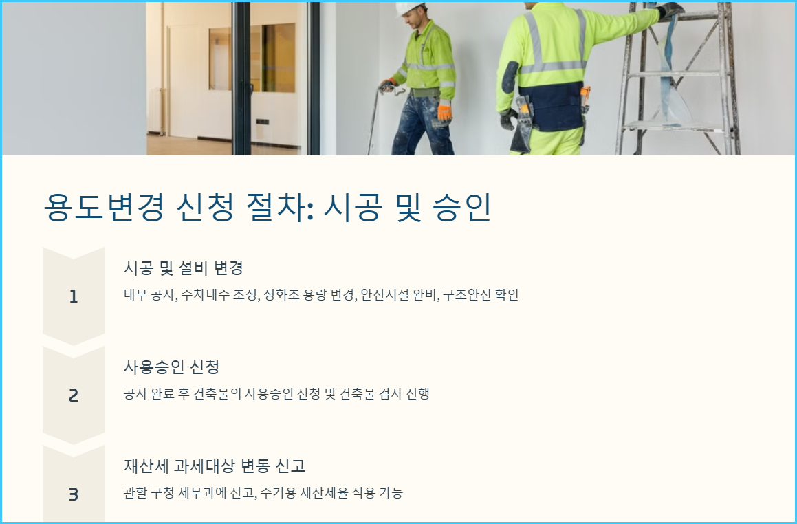 용도변경이 완료되면, 관할 구청 세무과에 재산세 과세대상 변동 신고를 해야 합니다. 이를 통해 주거용 재산세율을 적용받을 수 있습니다.