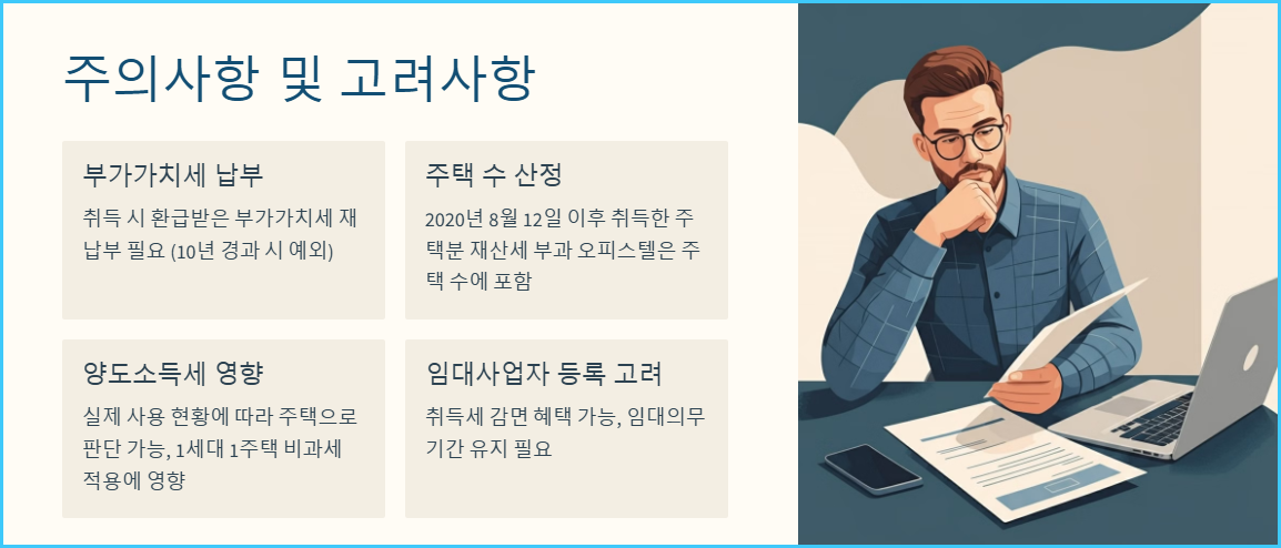 업무용 오피스텔 취득 시 부가가치세를 환급받았다면, 주거용으로 용도변경 시 환급받은 부가가치세를 다시 납부해야 합니다. 다만, 취득 후 10년이 경과한 경우에는 부가가치세를 납부하지 않아도 됩니다.