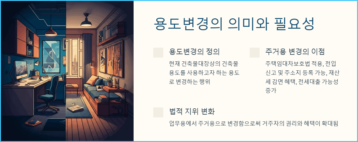 업무용 오피스텔을 주거용으로 용도변경하는 것은 여러 장점이 있지만, 동시에 세금 및 법적 고려사항도 많습니다. 용도변경을 고려하고 있다면, 위의 절차와 주의사항을 잘 검토하고 필요한 경우 전문가의 조언을 구하는 것이 좋습니다.
