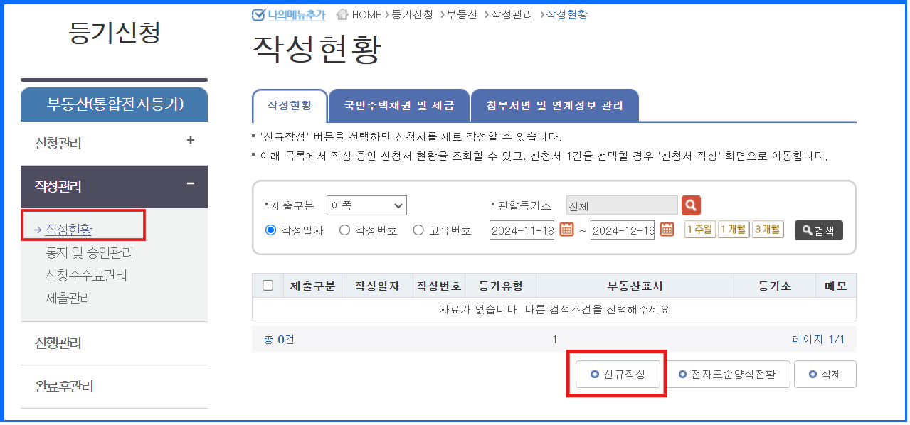 대법원 인터넷 등기소 홈페이지에 접속하여 로그인한 후, [통합전자등기] → [신규작성] 버튼을 클릭합니다.