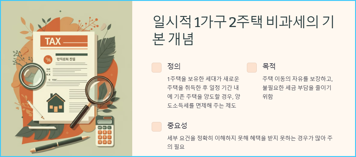 일시적 1가구 2주택 비과세란, 1주택을 보유한 세대가 새로운 주택을 취득한 후 일정 기간 내에 기존 주택을 양도할 경우, 양도소득세를 면제해 주는 제도입니다. 이는 주택 이동의 자유를 보장하고, 불필요한 세금 부담을 줄이기 위한 목적으로 시행되고 있습니다.