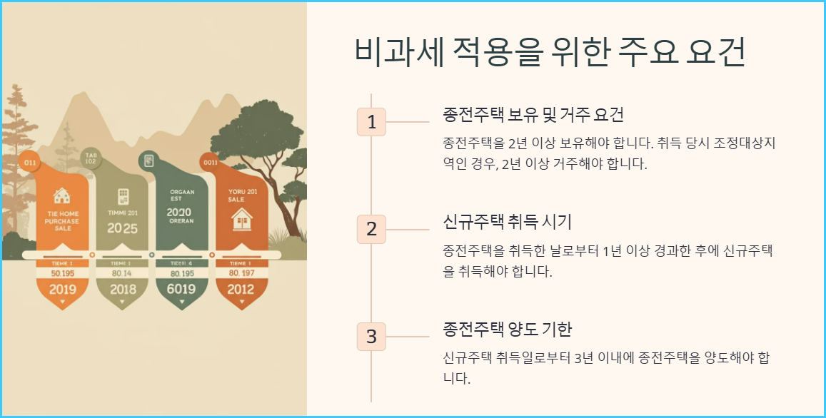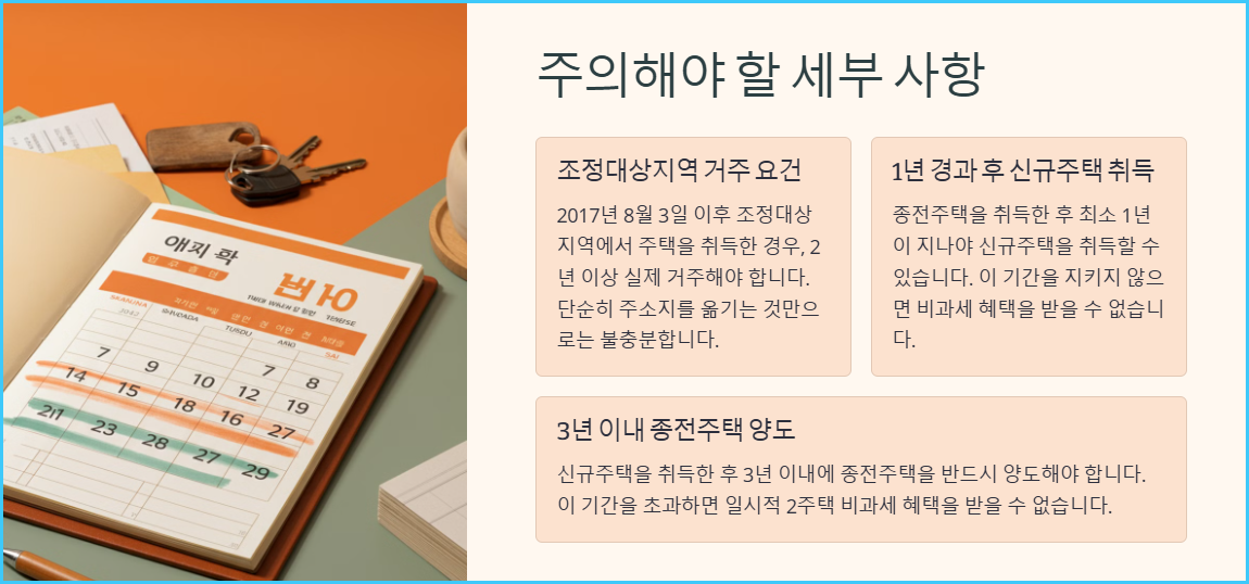 많은 사람들이 놓치기 쉬운 부분이 바로 이 요건입니다. 종전주택을 취득한 후 최소 1년이 지나야 신규주택을 취득할 수 있습니다. 이 기간을 지키지 않으면 비과세 혜택을 받을 수 없으니 주의가 필요합니다.