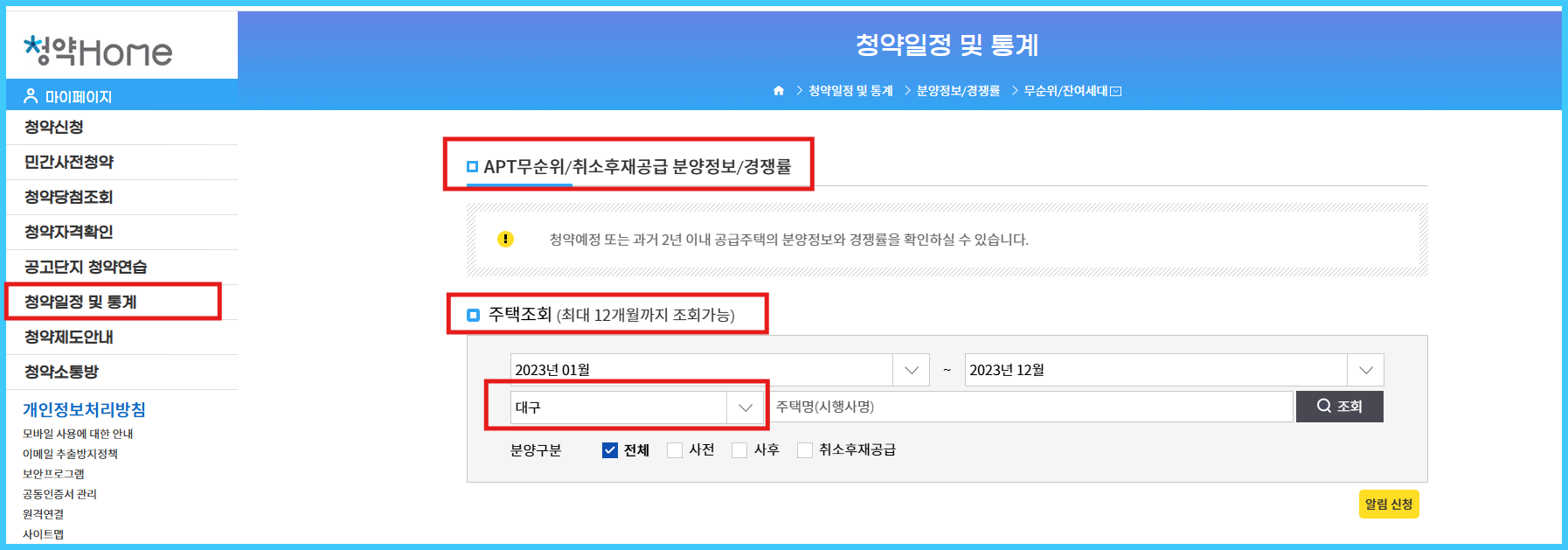 - 측 메뉴의 '청약일정 및 통계' 클릭