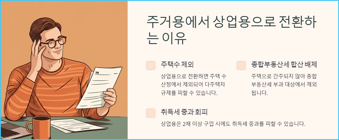 1. 주택수 제외: 상업용으로 전환하면 주택 수 산정에서 제외되어 다주택자 규제를 피할 수 있습니다.