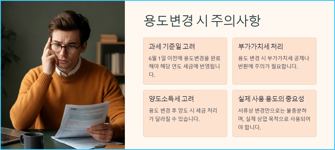 - 재산세와 종합부동산세의 과세 기준일인 6월 1일 이전에 용도변경을 완료해야 해당 연도 세금에 반영됩니다.
