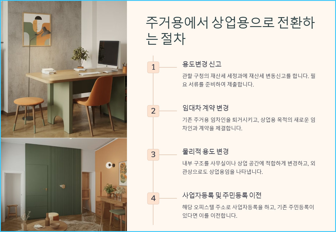 주거용 오피스텔을 상업용으로 전환하는 과정은 다음과 같습니다: