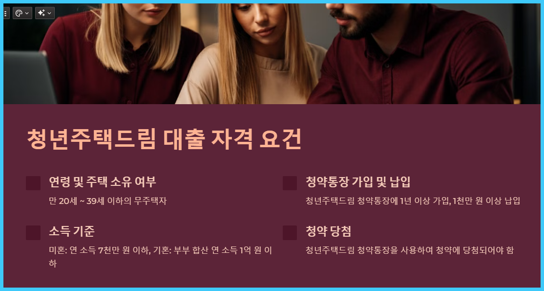 청년주택드림 대출을 받기 위해서는 다음 조건을 충족해야 합니다: