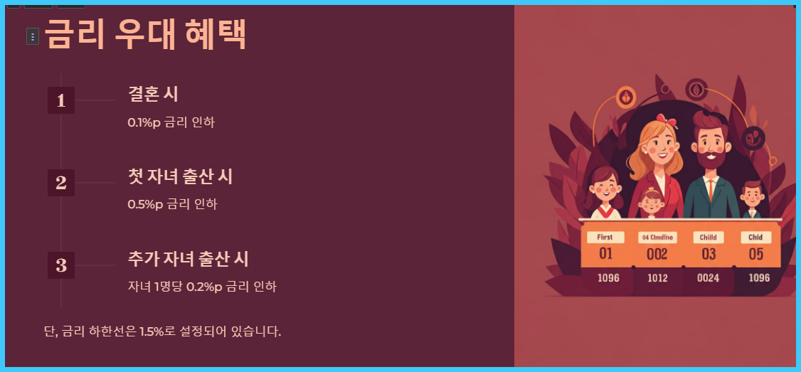 • 추가 자녀 출산 시: 자녀 1명당 0.2%p 금리 인하