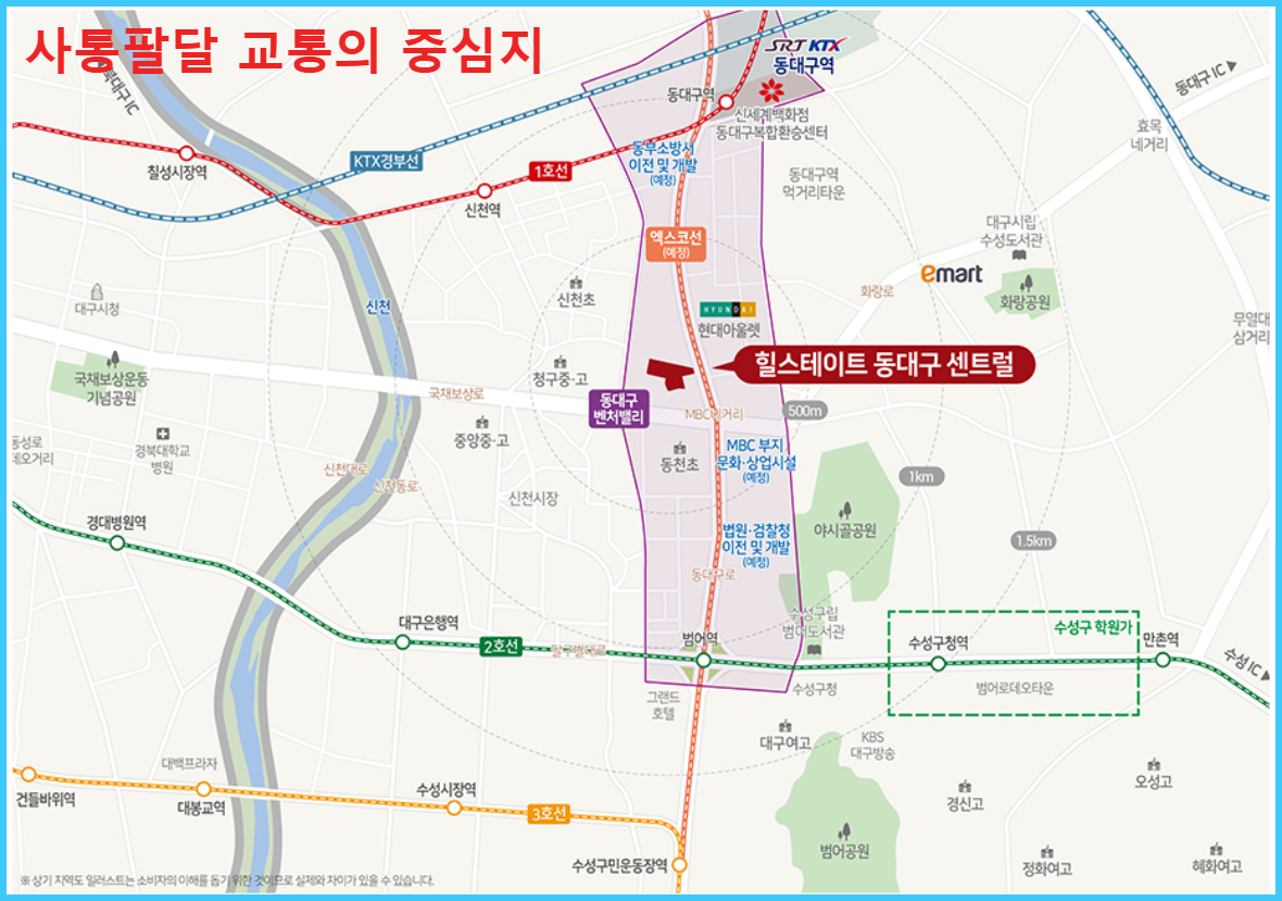 힐스테이트 동대구 센트럴은 행정구역상 동구에 속하지만, 실제로는 수성구 생활권에 포함되어 있습니다. 이는 수성구의 우수한 교육 환경과 생활 인프라를 누릴 수 있으면서도, 상대적으로 저렴한 가격에 주택을 구매할 수 있다는 것을 의미합니다.