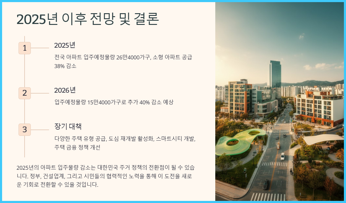 2025년 아파트 입주물량 감소는 단기적으로는 부동산 시장에 상당한 영향을 미칠 것으로 보입니다. 그러나 이는 동시에 정부와 업계가 주택 공급 정책을 재검토하고 개선할 수 있는 기회이기도 합니다.